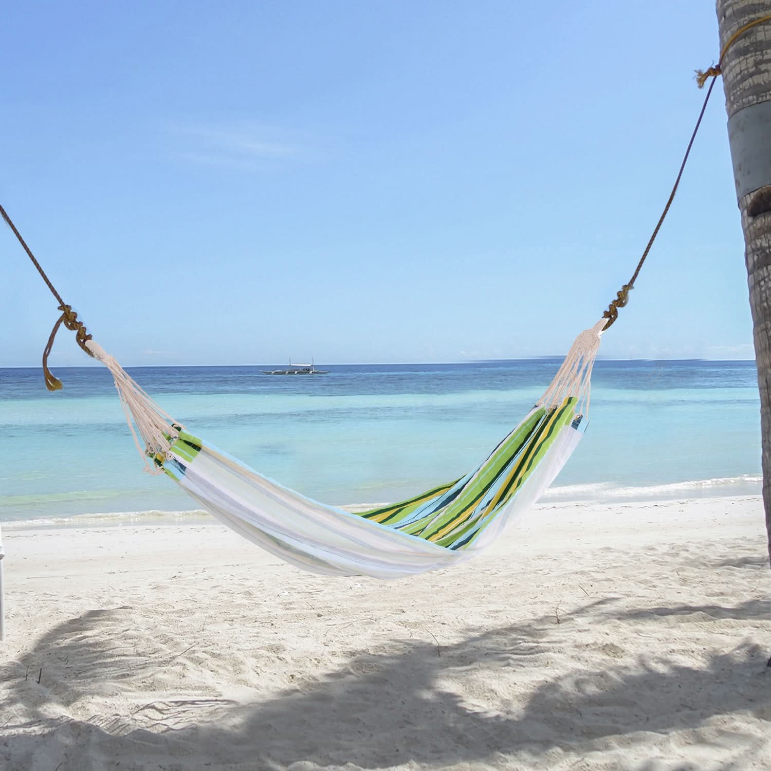 This hammock is perfect for relaxing in the sun. It's spacious, comfortable, and sturdy. Great for camping or just lounging in the garden. Highly recommend!